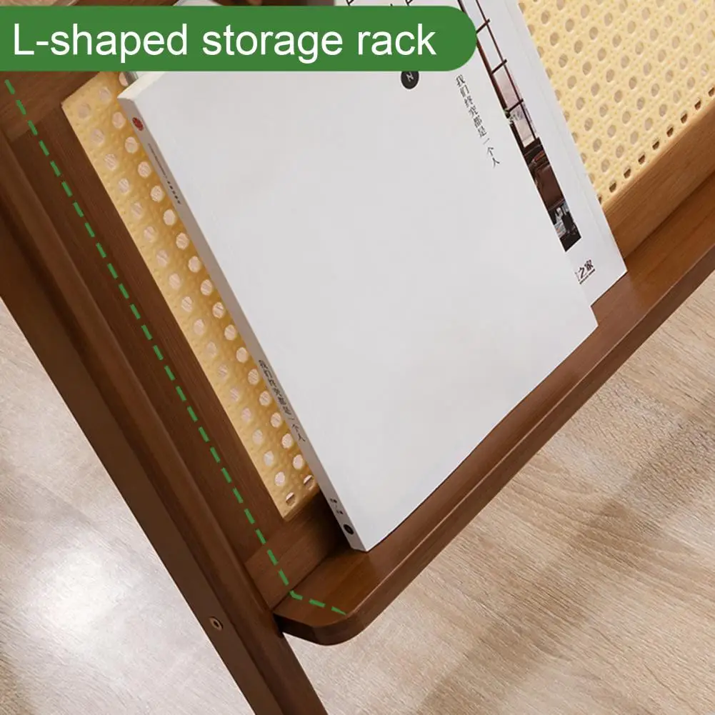 Stylish L-Shaped Design: Elevate your space with this bedside table's unique L-shaped design featuring rattan shelving. Blend modern and bohemian elements effortlessly for a stylish and practical room aesthetic.