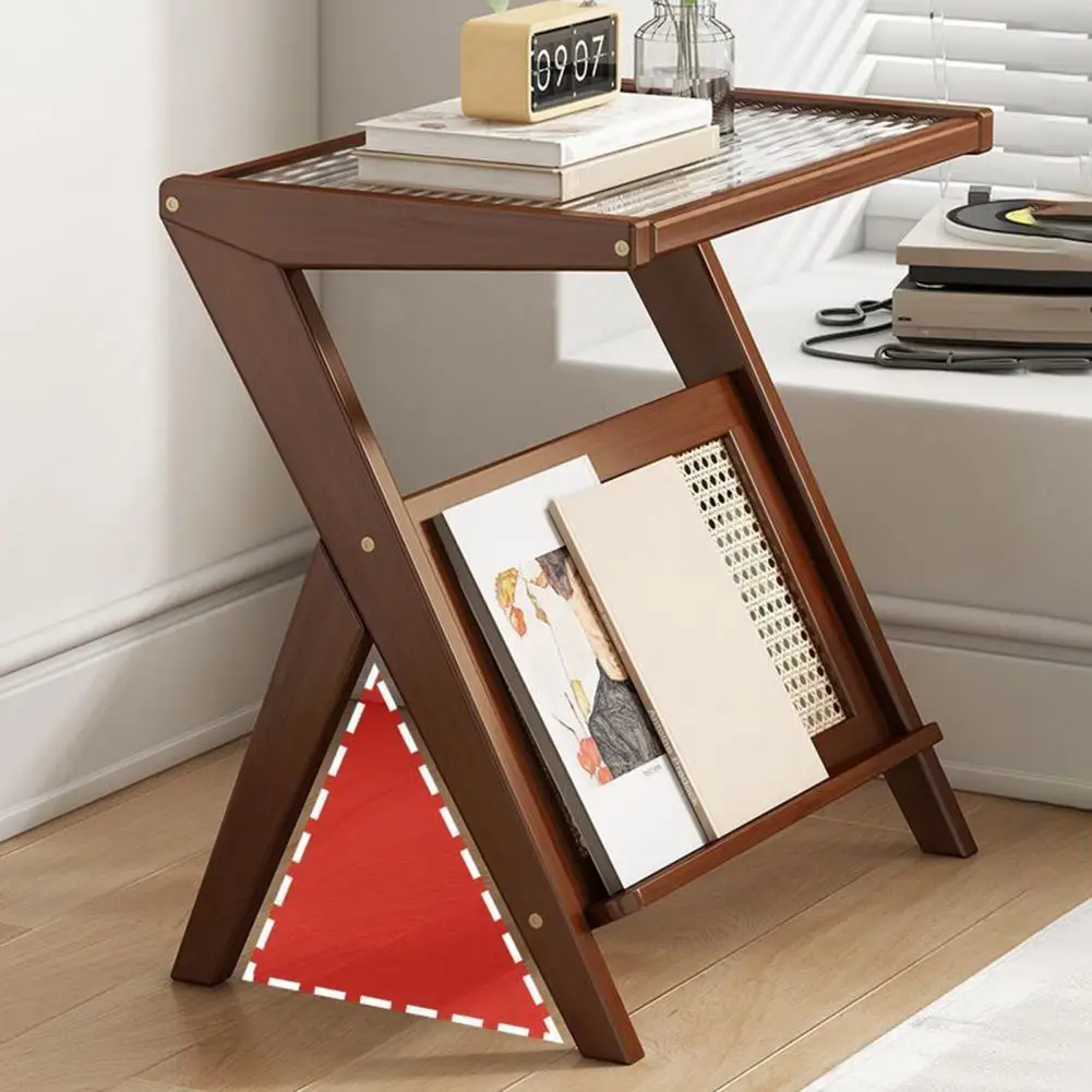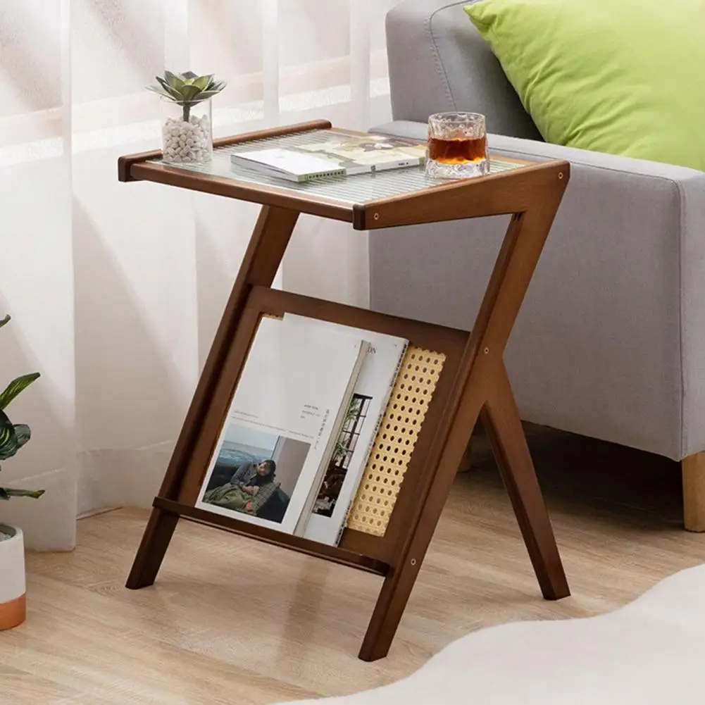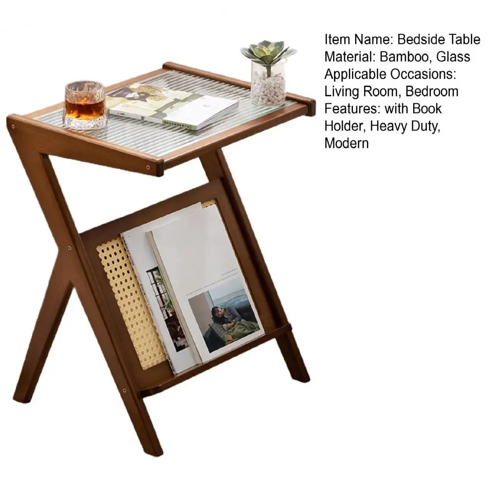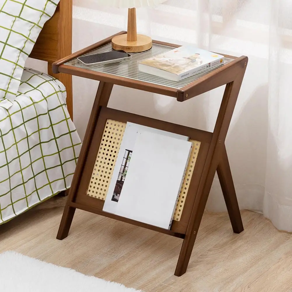 Nightstand Side Table with Rattan Book Magazine Shelf Bedroom Living Room Bamboo Glass Bedside Coffee Table Wooden End Table